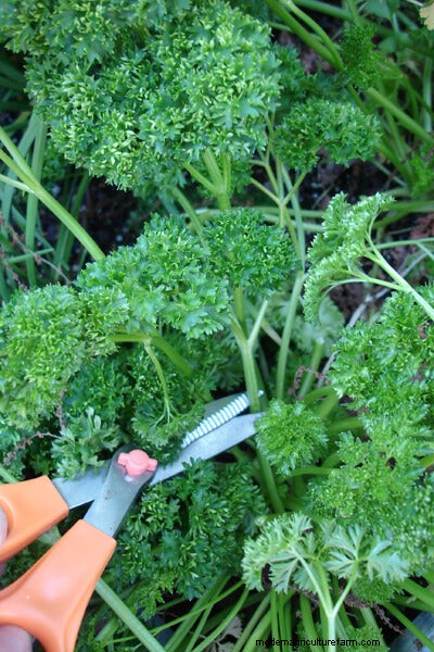 Gather parsley stems and leaves as needed. Harvest parsley by cutting the leafy stems from the base of the plant—this will also serve to make the plant grow back bushier. Freeze parsley for winter use; although it is easily dried, it does not keep its flavor well.