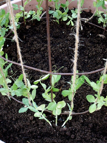 Green peas don't need a trellis, but pods will be easier to pick when vines are held upright. If you're using a trellis, insert it prior to planting. Use netting, stakes, and string, a wood frame trellis covered with chicken wire, metal fencing, or a collection of twiggy branches stuck into the ground among the plants. Peas attach by tendrils, tiny stems that curl and encircle supports. Tendrils quickly wrap around slender supports to hoist vines skyward.