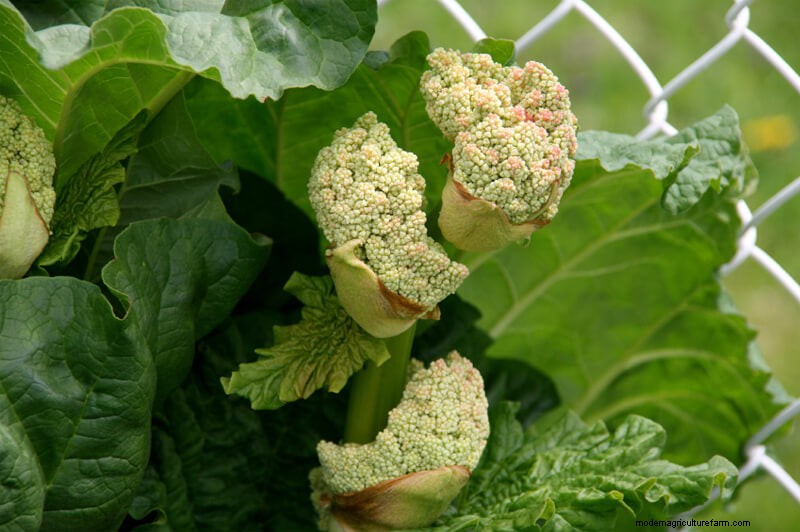 White stalks are rising out of the center of my rhubarb plants. What are they?