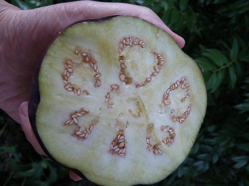 Fruits can taste bitter if picked when underripe or overripe, so harvesting is part of the eggplant grower's art. A perfect fruit will stop growing larger, have a glossy skin, and show a sprinkling of soft, well-formed yet immature seeds when you slice it open. Fruits with no visible seeds are immature, and hard, dark seeds are found in overripe eggplants. Use pruning shears to harvest fruit with a short stub of stem attached, because the fruits will not pull free by hand. Rinse clean, pat dry, and store in the refrigerator for several days. Eggplant discolors rapidly when cut open, so work quickly when preparing slices or skewers for grilling. Marinades that include salt, vinegar, and/or lemon juice will keep cut pieces from darkening.