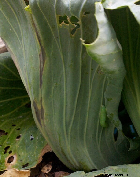 Your plant is probably being chewed by cabbage loopers or cabbageworms. Treat the cabbages with a product containing Bacillus thuringiensis (Bt) such as Dipel¨, a biological-type insecticide. This must be eaten by the worm and is activated in the worm's alkaline gut. The worm then dies slowly from terminal constipation. This takes two to three days, which means the worms are not killed immediately.