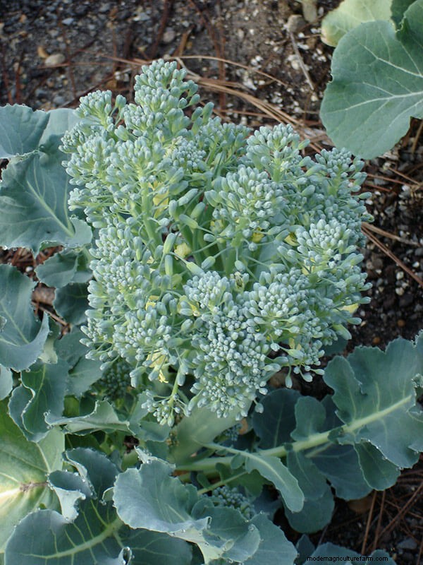 When you see a flower head beginning to form in the center of the plant, check its growth every day. Ideally, you harvest broccoli while the tiny buds are tightly closed. If the buds begin to swell or show yellow (the flower petals), cut the head from the stem right away, no matter how small it is, because the opening buds have a mealy texture. After cutting the main head, leave the plant to grow bite-sized side shoots in the axils of the leaves.