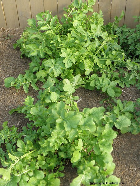 Young arugula tastes milder, and larger, more mature arugula tastes stronger. There are two ways to approach your problem. First, you can plant arugula every couple of weeks to ensure a continuous supply of mild but flavorful young leaves. On the other hand, you can harvest more leaves, so the plant needs to continually replace the old with new. Either way, you will need to replant periodically. Remember, arugula is like lettuce. It flowers in hot weather, so unless you live where the summer is cool, you will only have homegrown arugula in spring and fall.