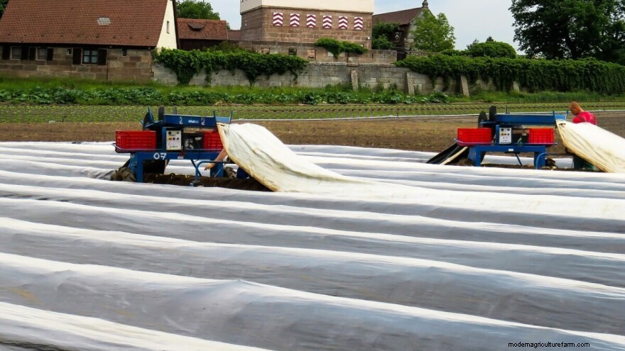 Green asparagus is harvested when the shoot is 7 – 9 inches long and its tip is still completely closed. It is cut with a special knife, slightly above the surface of the ground, but there is also mechanized harvesting. White asparagus can be planted underneath the foil to which one side is fully attached so that pickers on one side detect the foil, pick the shoots and cover the row with foil.
