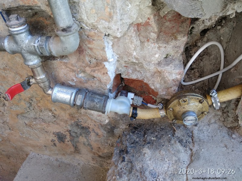 In the first picture, we see a connection via a ball tap with a home, water mains, then an electric valve (from a washing machine) and an old reduction, gas valve.
