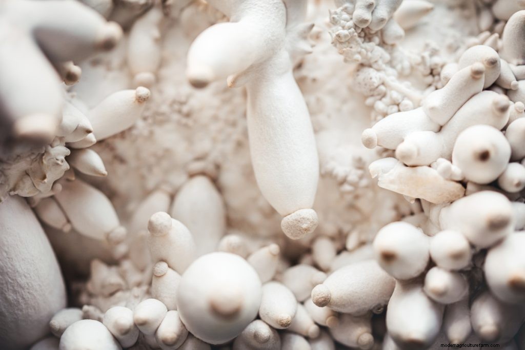 They look like dense knots or bumps of white mycelium extending upwards from the surface of the substrate.