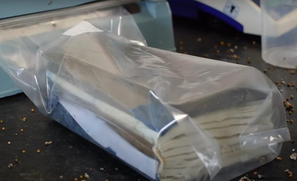 Once you’ve filled your book with as many layers of spawn as possible, it’s time to place it in a bag.