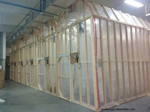 You can create a wooden stud frame and cover it in plastic sheeting, like Blanc de Gris Mushroom Farm did in Montreal. If yo do choose this method, keep in mind that plastic sheeting is harder to clean than rigid walls.