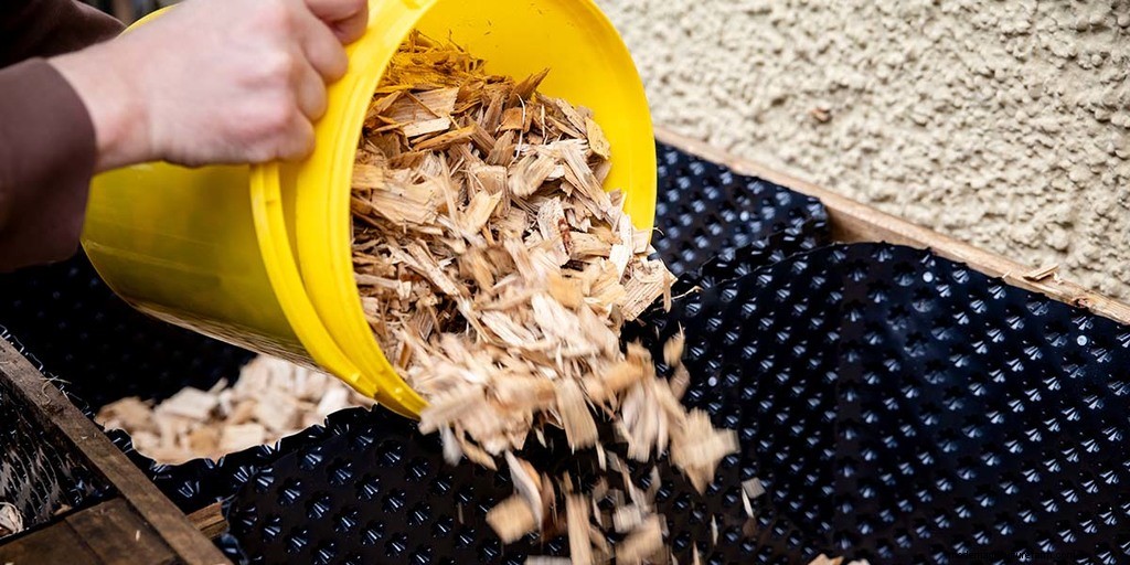 You can use all kinds of shredded wood chips or garden mulch for this. Although avoid using any type of wood chips that have been treated with chemicals.