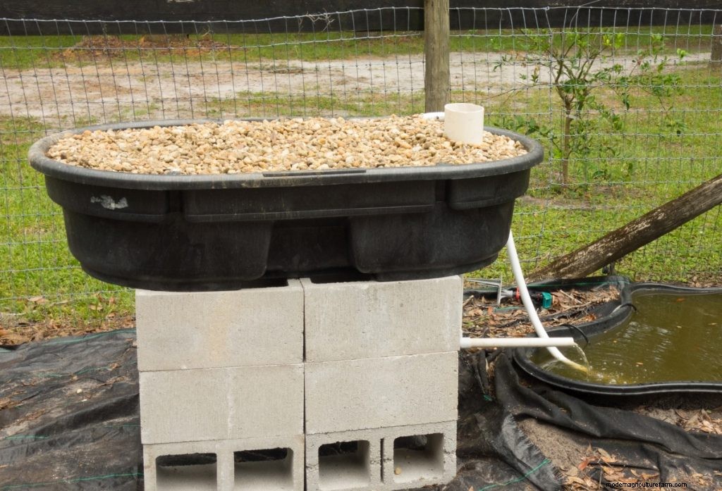 The water should be pumped up to the grow bed, travel uniformly through the bed, and drain back into the tank.