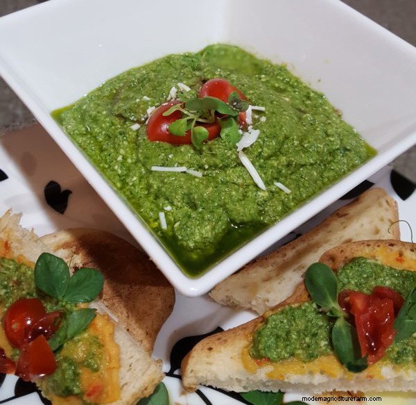 Pesto is a versatile sauce. I like to put it on pasta, but you can use it as a salad dressing, as a condiment on sandwiches, or plenty of other applications. This recipe uses a mix of sunflower microgreens and sweet pea shoots.