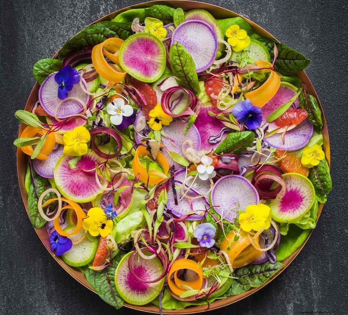 It features microgreens, radishes and thinly peeled carrots, and even edible flowers!