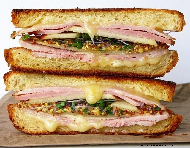 14) Grilled Cheese With Ham And Brie Sandwich With Microgreens, Apple and Dijon