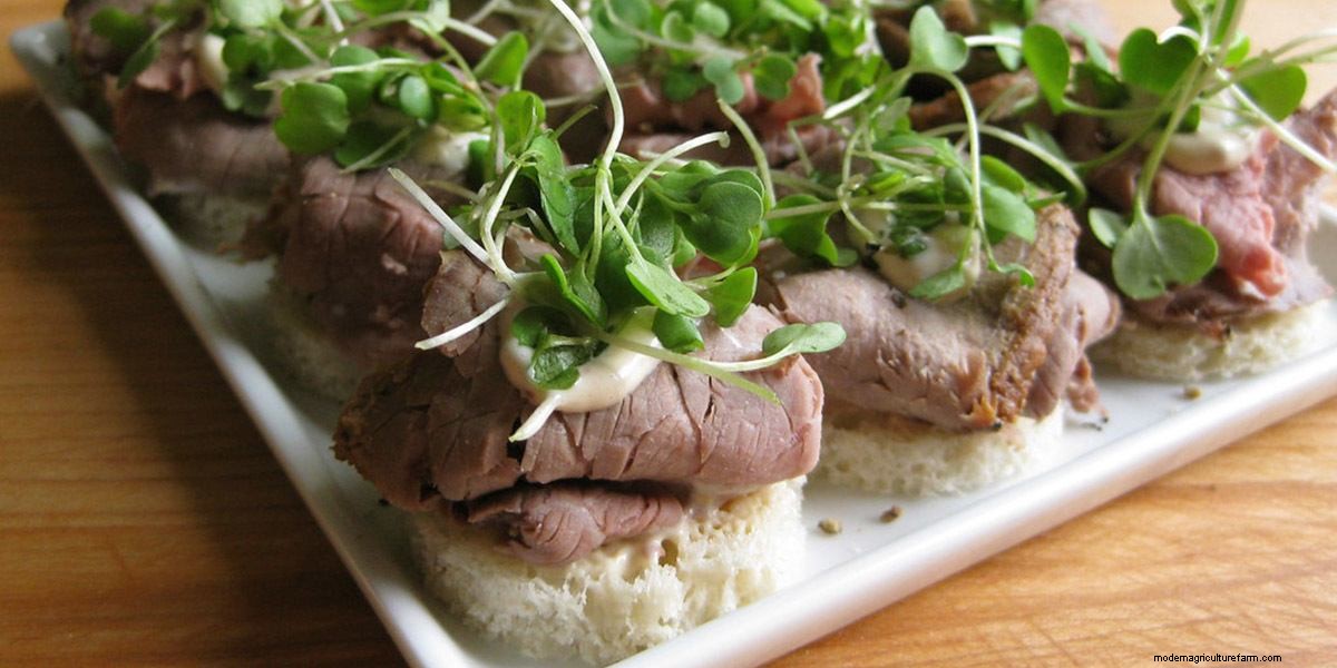 These open-faced roast beef sandwiches make a great snack or an entire meal, depending on how hungry you are! The arugula microgreens give it a nice bitter, slightly peppery taste.