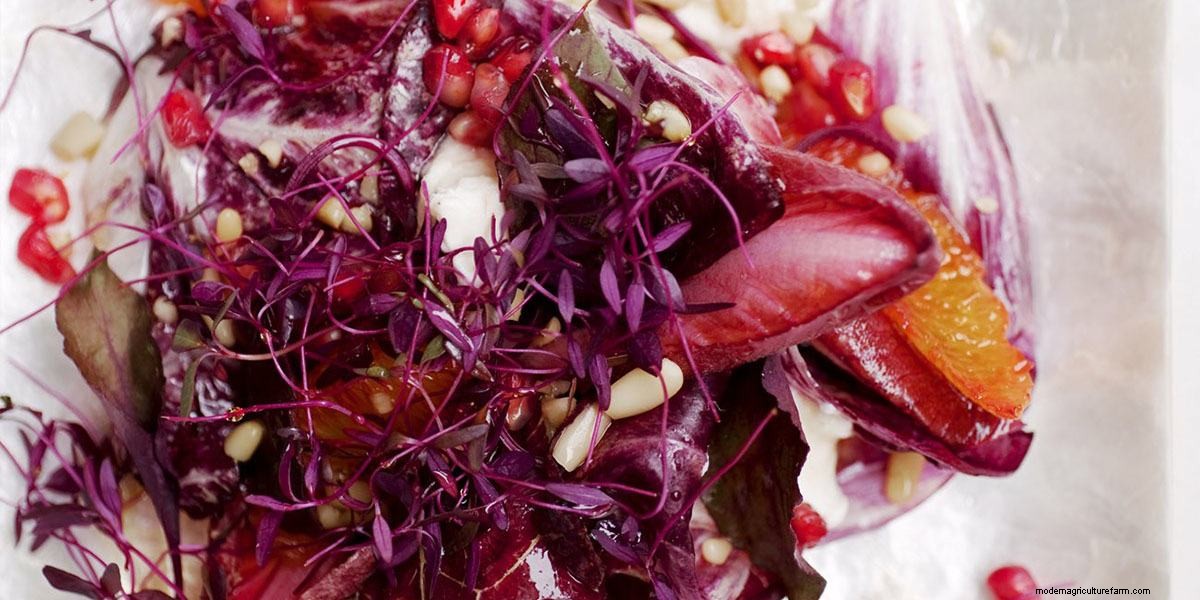 Wow, this is one purple salad! With blood oranges, radicchio, microgreens and other unconventional ingredients, it’s certainly a flavor you’ve never tried before.