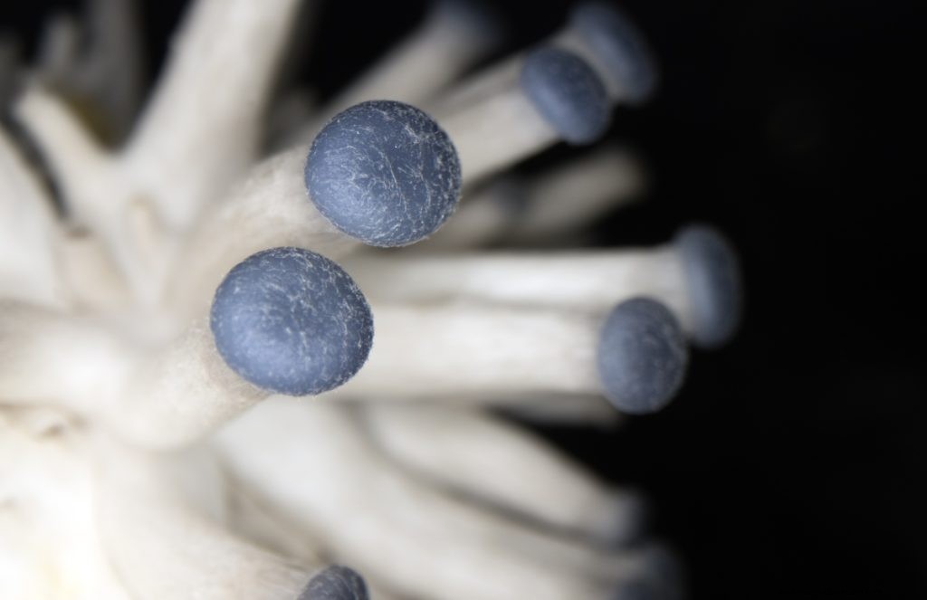 When oyster mushrooms first begin pinning, they start out blue and then start to turn gray as the mushroom grows.