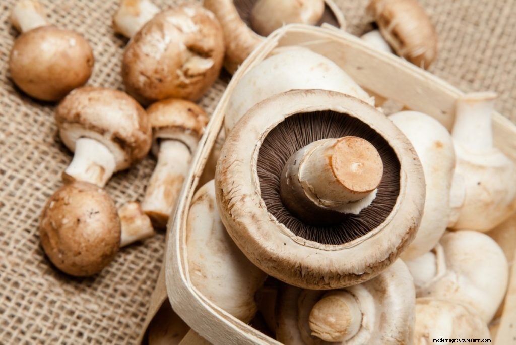Button or white mushrooms, which are entirely white, are baby Agaricus bisporus harvested when the mushrooms are very young.