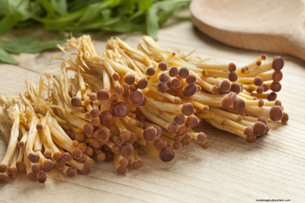 Enoki mushrooms have long thin stems and small caps and, like maitake, are also commonly used in Japanese and Chinese cuisine.