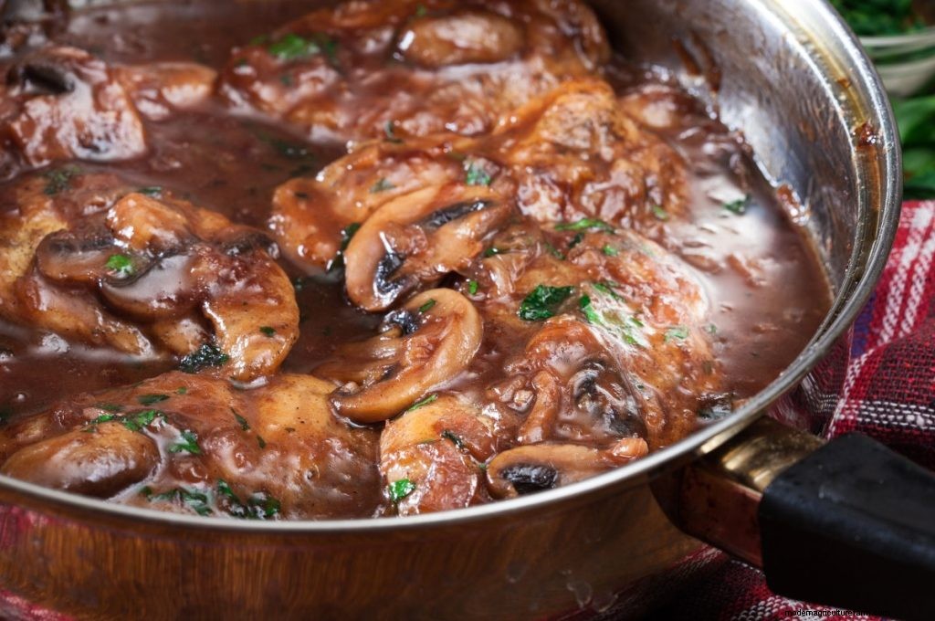 - Add the Marsala wine to the mushrooms. Bring to a boil and simmer for a few minutes until the liquid reduces by half.