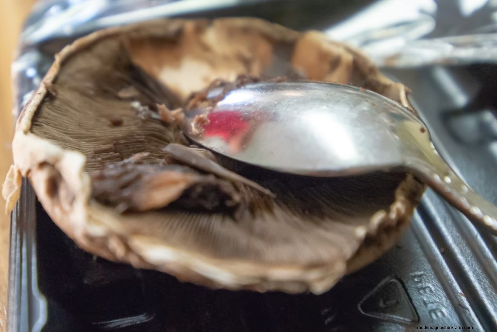 Next, you need to remove the gills. Hold the portobello in your hand with the gills facing up, and using a spoon, lightly scrape off the gills.