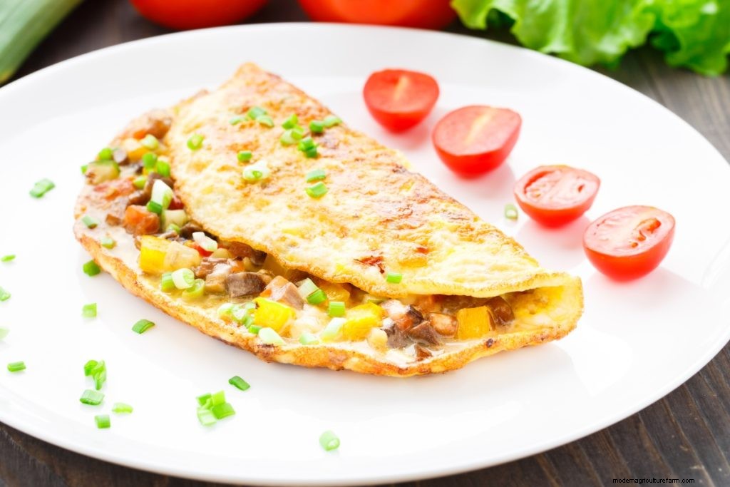 - Sprinkle the mushroom mixture on one half of the omelet and use a spatula to fold the other half on top. Cook for two minutes, then check that the omelet is fully cooked by piercing the thickest part with a knife. It’s ready if there is no runny egg inside. Slide the omelet onto a plate and let it cool.