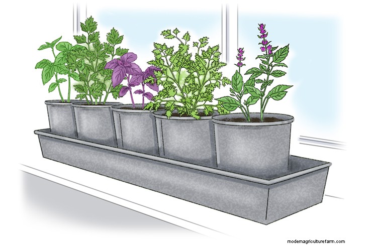 Indoors, you can grow individual herbs on a windowsill in single pots. Terra cotta pots allow the soil to dry out quickly, while metal or plastic planters will keep the soil moist a bit longer. Regular potting soil works well for these types of planters.