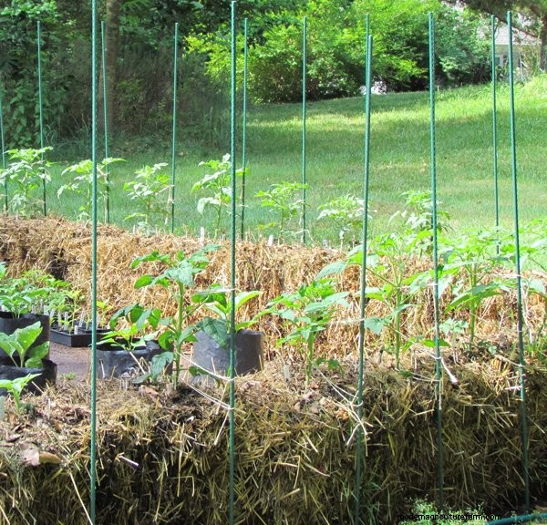 A good way to support tall plants, such as tomatoes, is with sturdy stakes hammered through the bale and into the ground underneath. Wire tomato cages work for medium-sized plants, such as peppers, eggplants and compact tomatoes, but taller plants can end up a bit unstable as they become laden with the harvest and the bales soften.
