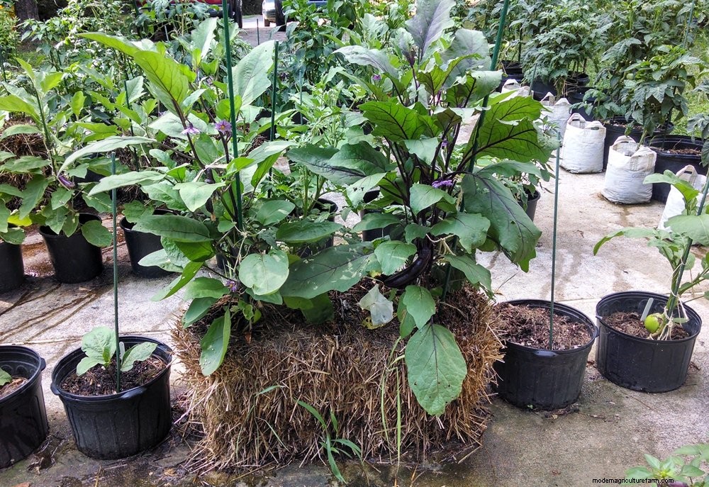 Two eggplants, nearing harvest. This is part of a trial in 2014, which was a big success. Neighboring containers beside the bale were not nearly as big and productive.