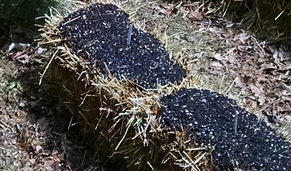 Two prepared bales, top-coated with potting mix. Squash seeds will be planted here when warm weather arrives.