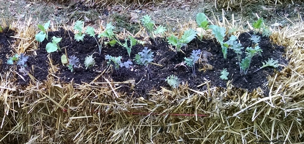 To plant seedlings tomato, pepper, eggplant and greens make a gap or divot in the top of the bale and set the roots in place. Fill in around the roots with a good-quality, peat-based potting soil, ensuring that the seedlings are well-seated and level with the surface of the bale. Water gently and, if needed, add more soil to fill gaps and stabilize the seedling.
