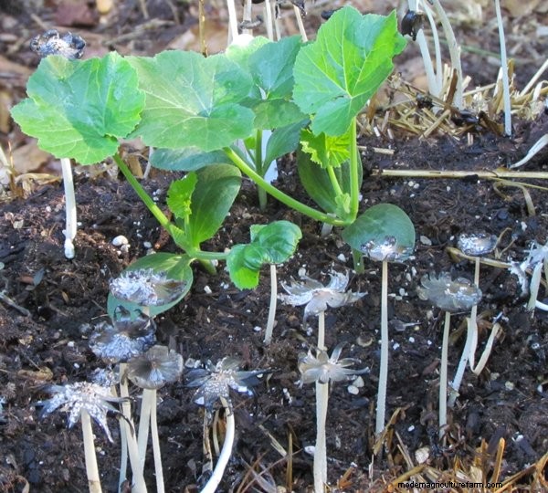 Squash seedlings with mushrooms, which are common early in the season. The harmless mushrooms can be left in place. They will disappear quickly.
