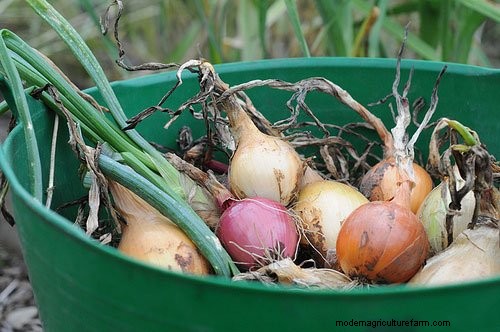 A harvest of several types of onions. In general, red onions and yellow onions are good keepers; white onions are not as good.