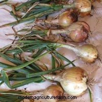 Onion seeds must be started indoors, several months before they’re planted into the garden. Broadcast the seeds so they are about 1/2″ apart and cover lightly with soil. Once the plants are up and the stems have straightened, trim the tops with scissors to a height of about 2″. Repeat every couple weeks (sort of like trimming a Chia pet) until it’s time for your onion plants to go into the garden. These haircuts force energy into the roots and also keep the plants from toppling over. Onions are heavy feeders, so be sure to amend the soil in the planting area with compost and a granular organic fertilizer. Set the seedlings (which may be less than 1/8″ in diameter at the base) about 6″ apart in each direction. Keep them well-watered and well-weeded, and make sure they don’t get shaded by neighboring plants.