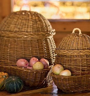 In late summer when the potato foliage has died back, your potatoes can be dug and “cured” for storage. Curing toughens up a potato’s skin and extends its storage life. Cure the tubers by laying them out on newspaper in a well-ventilated place that’s cool (50 to 60 degrees F.) and dark (so they don’t turn green). After about two weeks, the skins will have toughened up. Rub off any large clumps of dirt (potatoes should never be washed before storage) and cull any damaged tubers, which should be eaten, not stored. Treat the tubers very gently so as not to bruise or cut them. Nestle your spuds into ventilated bins, bushel baskets, a Root Storage Bin or a cardboard box with perforated sides. Completely cover the boxes or baskets with newspaper or cardboard to eliminate any light. Even a little light will cause potatoes to turn green and be rendered inedible. The ideal storage temperature for potatoes is 35 to 40 degrees, though they will usually keep for several months at 45 to 50 degrees.