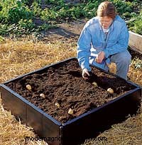 Sarah started by loosening the soil underneath the Grow Bed with a garden fork, and then filled the bed with regular garden soil. Two days prior to planting, she cut three seed potatoes into pieces with at least two or three eyes each and allowed them to callous over. She then planted a total of eight pieces per bed, 4-5" deep and 8" apart in two parallel rows (see photo, at right). You only need eight pieces per bed.