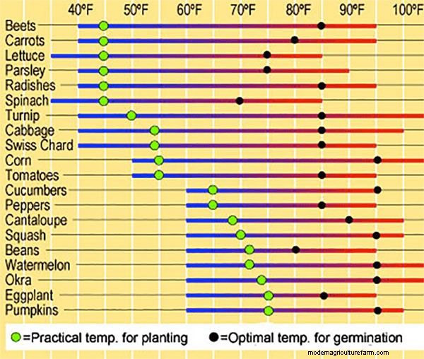 For each type of seed — beans, carrots, lettuce — there is a range of temperatures at which that particular type of seed will germinate (see the chart at right). Beans, for example, will only germinate if the soil temperature is above 60 degrees F and no warmer than 95 degrees F.