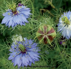 First appeared in England around 1570. Some imaginative folk names include love-entangle and Jack-in-prison. I grow them because every part of this plant is decorative: the leaves, blossoms and the striped seedpods. It is hard to resist popping the seedpods when they are green because they burst like little balloons.