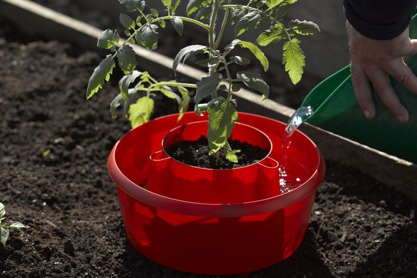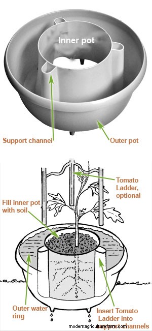 Tomatoes require plenty of water and nutrients to stay healthy and produce heavy crops. Keep the soil in the inner pot moist at all times. Add water to the outer ring to keep the root zone evenly moist. As plants grow, increase the watering frequency. Add water-soluble fertilizer, such as Plant Health Care, to the inner pot weekly, following package directions.