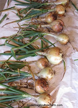 Harvesting onions is easy, and is the same for all globe onions. By midsummer, when the bulbs start to fatten up, you can begin harvesting individual onions as needed. In late summer or early fall, the leaves on your onion plants will start to flop over. This happens at the "neck" of the onion and it signals that the plant has stopped growing and is ready for storage. Onions should be harvested soon thereafter.