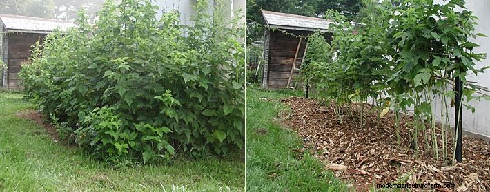 When the midsummer raspberry crop ends, it's good practice to cut out the canes that bore fruit — right to the ground. This is the end of their second year, so they are beginning to decline anyway.