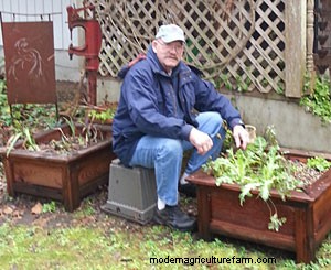 Dean Failor at his garden in South Beach, Oregon. Even in December, he has greens to harvest.