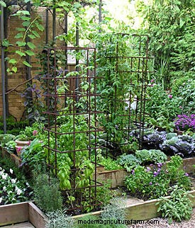 Small-space gardens like this one offer creative ideas for combining vegetables and flowers in compact plantings.