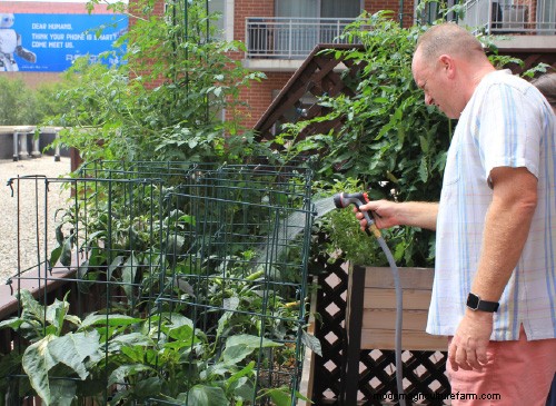 Jerry had two problems to conquer when he began. Although he has a sizable balcony, his view of the building’s parking garage is not ideal. Softening its harsh lines with plants in elevated garden boxes has dramatically changed the feeling of his space. But while he has plenty of room for a 2’x8’ elevated planter box, two standing gardens, several window boxes, a Honeycomb tomato planter, seating for four, and a grill setup, he has no outdoor water source.