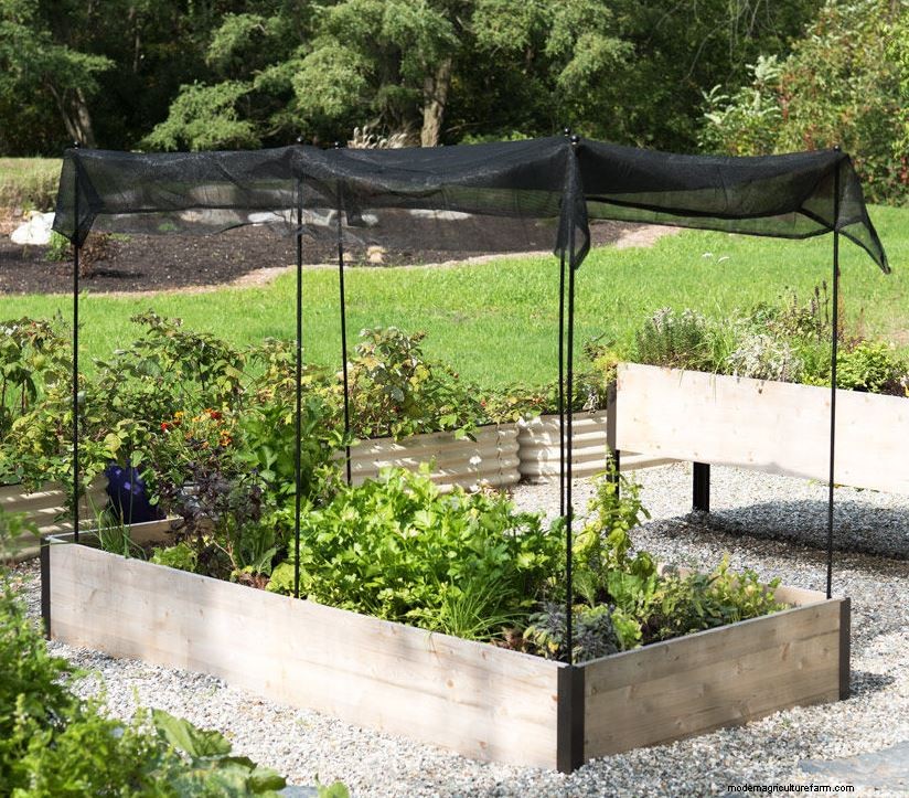 Hot weather can be just as challenging as cold weather. Young plants can be stressed and stunted by excessive heat; salad greens turn bitter and go to seed, and getting seeds to germinate can be very difficult. Shade netting keeps plants and soil cool and helps retain moisture. It can be laid right over wire hoops or a movable wooden frame. A piece of wood lathe attached to a frame can serve the same purpose.