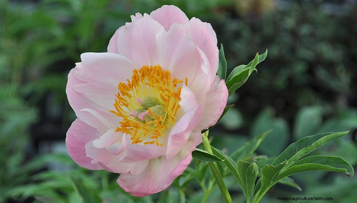 Abalone Pearl peony is a stunning semi-double variety with soft pink-peach petals contrasting with vibrant orange anthers.