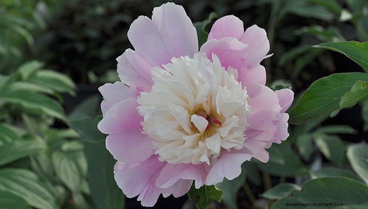 Bowl of Beauty peony's puffy white center contrasts nicely with the pink to magenta outer petals.