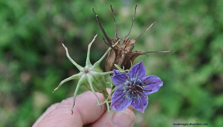 Collecting seeds in late summer and fall for replanting in spring is not only fun, it saves money, too! This is the flower, unripe seedpod, and ripe seedpod of nigella, an old-time favorite commonly called love-in-mist. Photos: Suzanne DeJohn