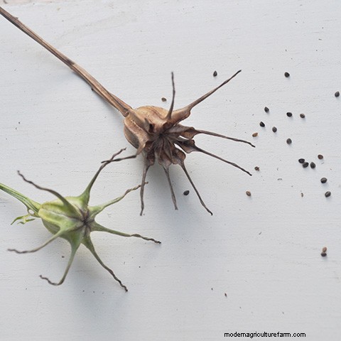 Unripe (green) nigella seedpod is closed at the top. Once the pod is ripe the top sections open and the seeds readily spill out.