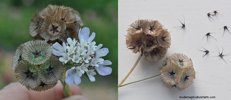 Scabiosa stellata forms whimsical seed pods punctuated with star-shaped seeds. The seeds are ready to collect when the seedhead turns completely brown and the seeds fall away.