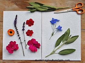 Create a collage by tacking the leaves and flowers to a sheet of paper with small dabs of glue. You can frame the collage as is or photocopy it to make multiple notecards or framed prints. I've found that photocopied pressed flowers look very real and they won't dry out and fade like the real plant material does.